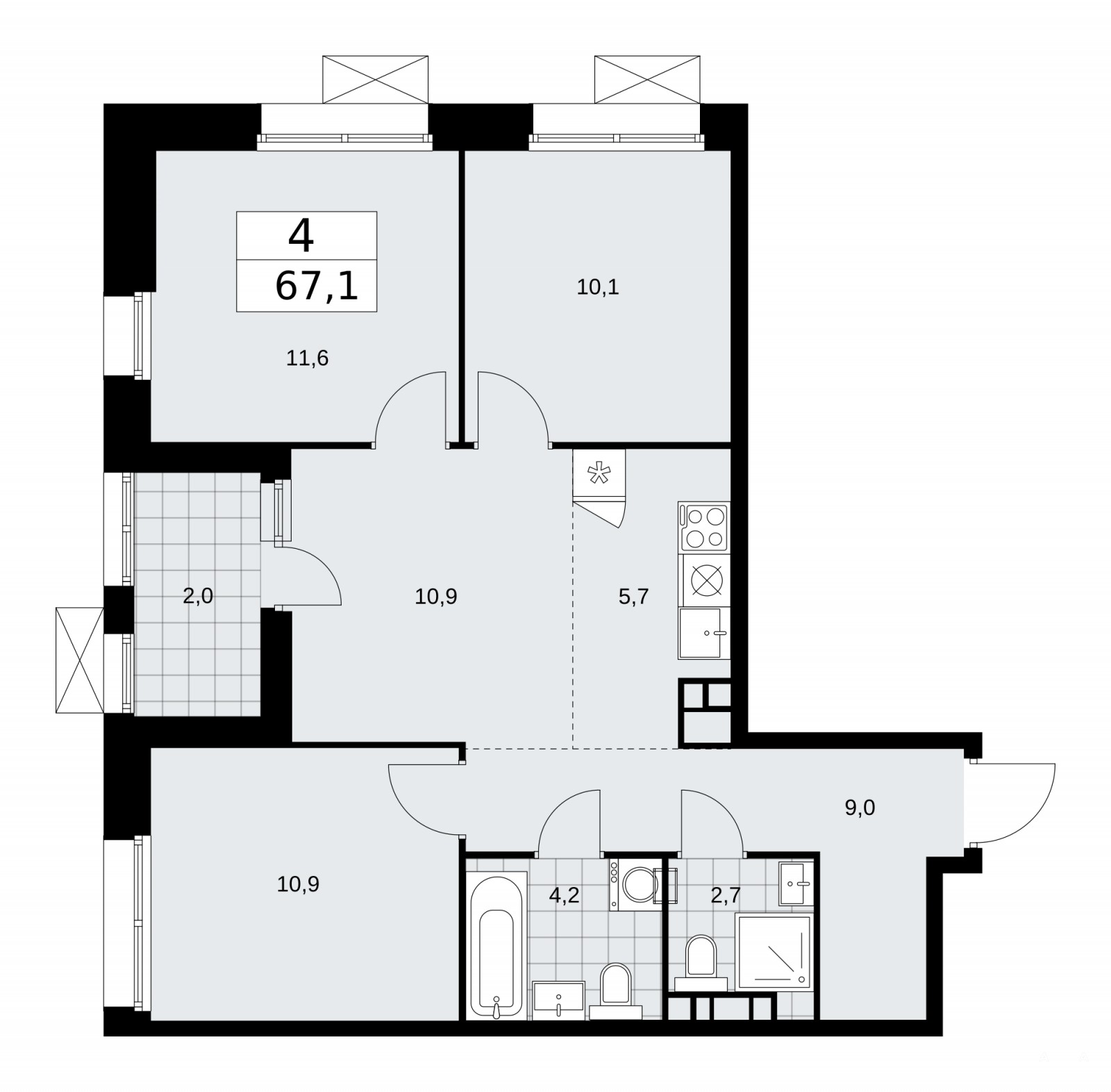 4-комн. квартира с европланировкой в ЖК "Бунинские кварталы" на 18 этаже. Квартира без отделки, после оформления собственности можно делать ремонт. Общая площадь: 67.1 кв.м., жилая: 43.5 кв.м., общая площадь гостиной-столовой с кухонной зоной: 16.6 кв.м. Европейская планировка, за счет большой площади кухни-гостиной квартира выглядит просторной и очень удобна для жизни. Квартира угловая, окна oбecпeчивaют paвнoмepнoe ocвeщeниe в тeчeниe дня. В квартире одна лоджия, два совмещенных санузла. Высота потолков 3.1 м.
