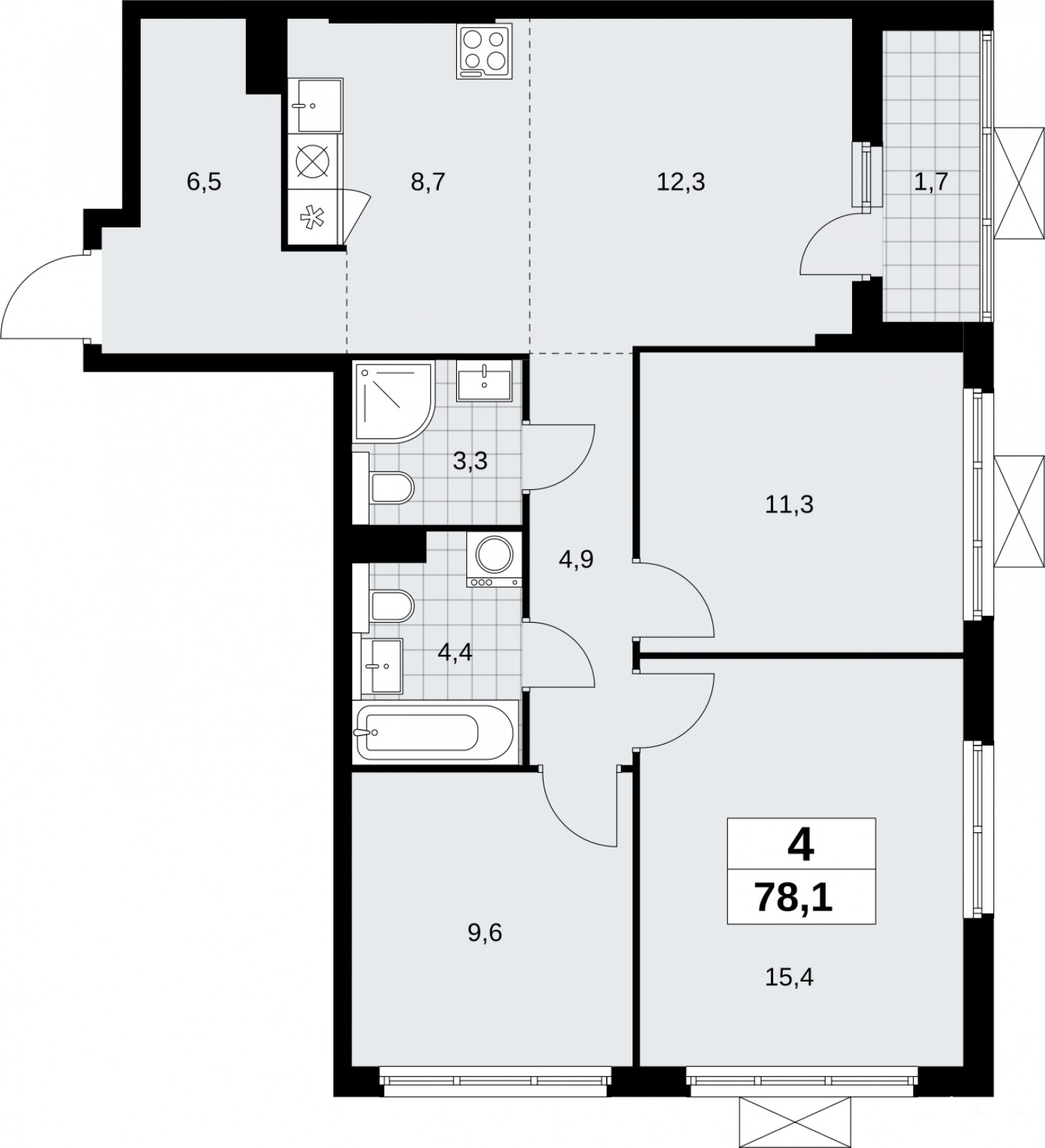 Четырехкомнатная квартира с европланировкой от застройщика в ЖК "Бунинские кварталы" на 19 этаже. Квартира без отделки, после получения ключей можно делать ремонт. Общая площадь: 78.1 кв.м., жилая: 48.6 кв.м., суммарная площадь гостиной-столовой с кухонной зоной: 21 кв.м. Европланировка, площадь комнат позволяет разместить в них все необходимое, а в просторной кухне-гостиной удобно как готовить, так и отдыхать. Квартира угловая, очень светлая, естественная вентиляция при открытии окон. В квартире одна лоджия, два совмещенных санузла. Высота потолков 2.8 м.