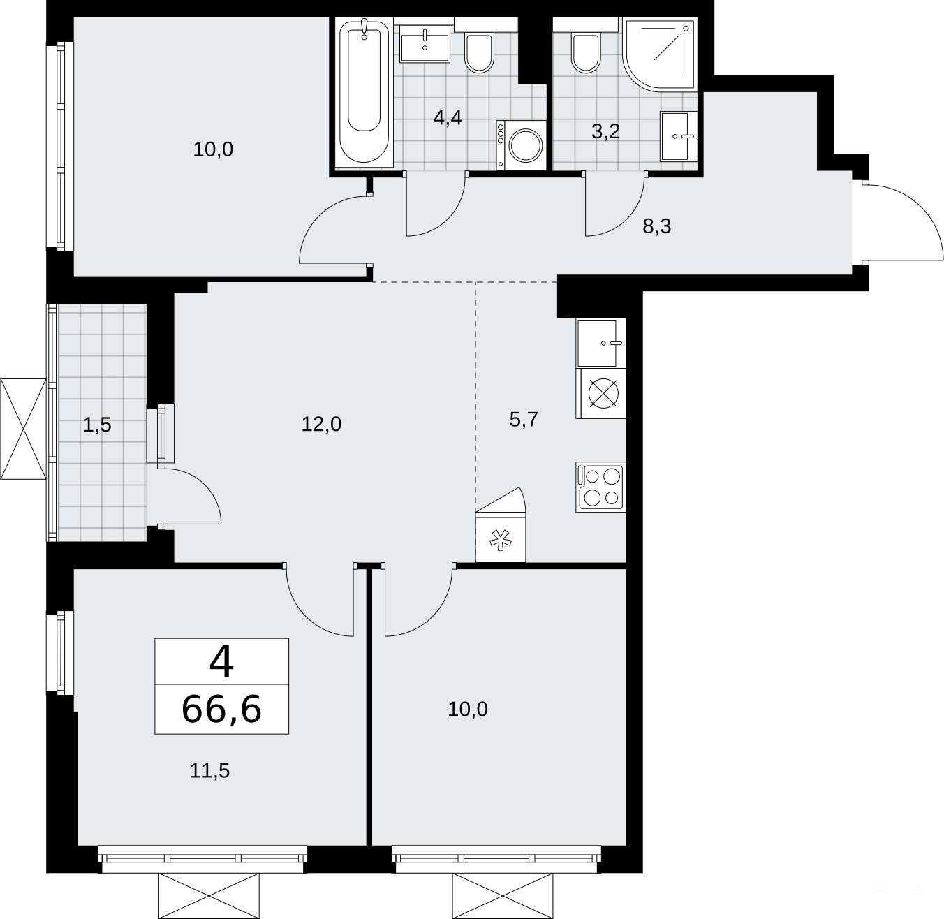 Четырехкомнатная квартира с европланировкой от застройщика в ЖК "Бунинские кварталы" на 16 этаже. Квартира без отделки, после оформления собственности можно делать ремонт. Общая площадь: 66.6 кв.м., жилая: 43.5 кв.м., суммарная площадь гостиной-столовой с кухонной зоной: 17.7 кв.м. Европланировка, площадь комнат позволяет разместить в них все необходимое, а в просторной кухне-гостиной удобно как готовить, так и отдыхать. Угловая квартира, окна oбecпeчивaют paвнoмepнoe ocвeщeниe в тeчeниe дня. В квартире одна лоджия, два совмещенных санузла. Высота потолков 2.8 м.