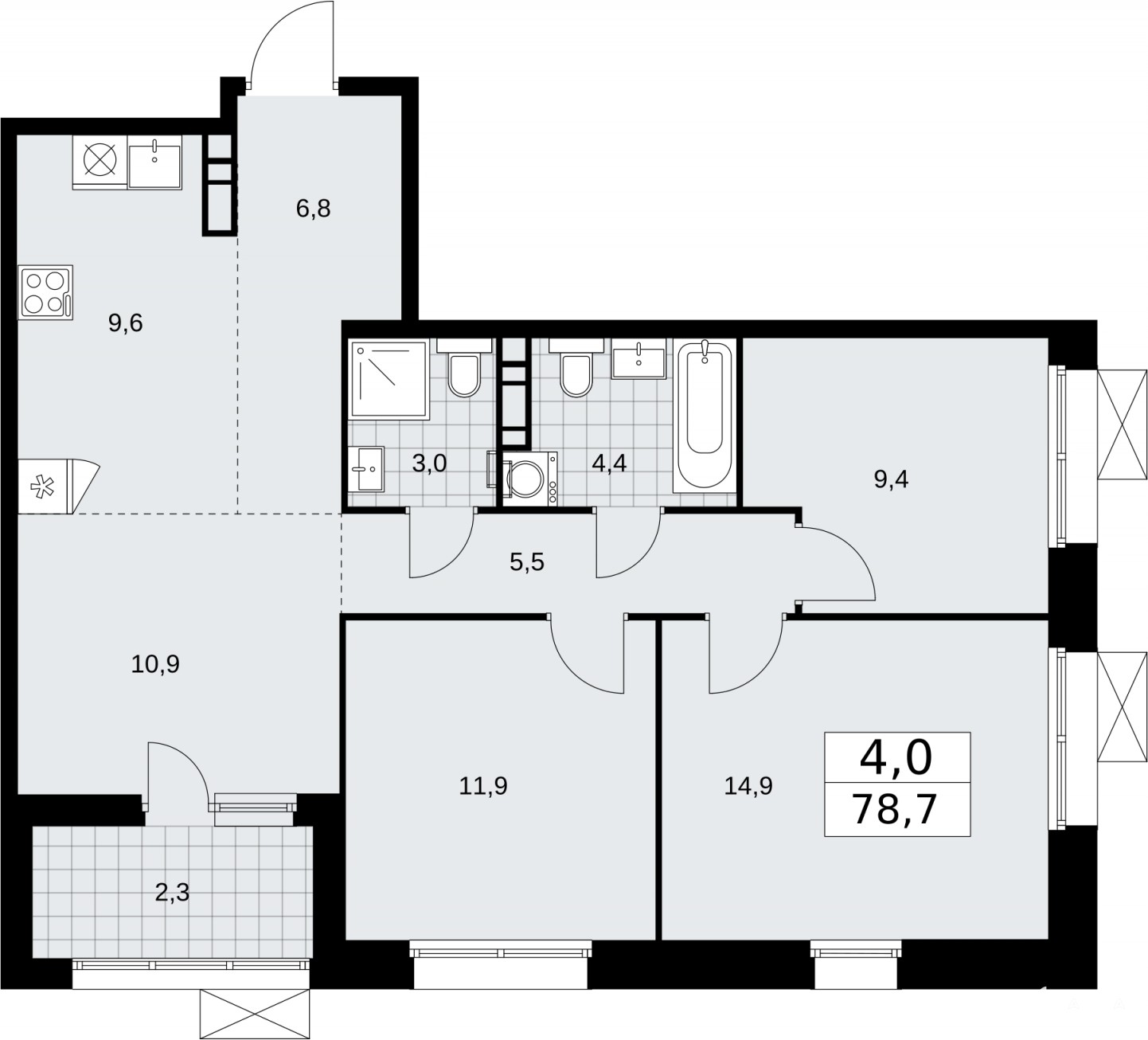 Просторная 4-комн. квартира с европланировкой и отделкой в ЖК "Бунинские кварталы" на 20 этаже. Общая площадь: 78.7 кв.м., жилая: 47 кв.м., общая площадь гостиной-столовой с кухонной зоной: 20.6 кв.м. Европланировка, зона гостиной комнаты объединена с кухней. Угловая квартира, очень светлая, естественная вентиляция при открытии окон. В квартире одна лоджия, два совмещенных санузла. Высота потолков 3.1 м.