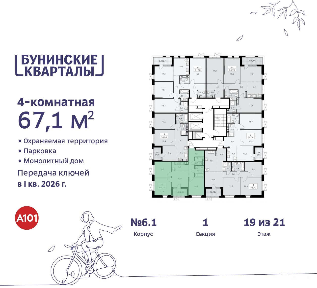 Продается 4-комн. квартира бизнес-класса с европланировкой и отделкой в ЖК "Бунинские кварталы" на 19 этаже. Общая площадь: 67.1 кв.м., жилая: 43.5 кв.м., суммарная площадь гостиной-столовой с кухонной зоной: 16.6 кв.м. Европейская планировка, зона гостиной комнаты объединена с кухней. Квартира угловая, очень светлая, естественная вентиляция при открытии окон. В квартире одна лоджия, два совмещенных санузла. Высота потолков 3.1 м.