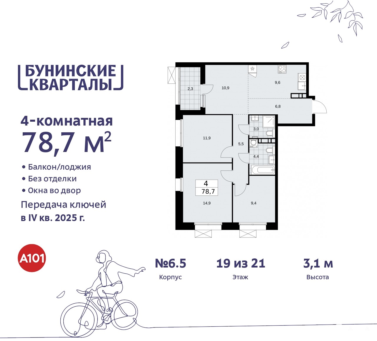 Продается 4-комн. квартира бизнес-класса с европланировкой от застройщика в ЖК "Бунинские кварталы" на 19 этаже. Квартира без отделки, новый владелец может сделать ремонт по индивидуальному проекту. Общая площадь: 78.7 кв.м., жилая: 47 кв.м., общая площадь гостиной-столовой с кухонной зоной: 20.6 кв.м. Европейская планировка, кухня-гостиная - идеальный вариант для тех, кто любит часто принимать гостей. Квартира угловая, очень светлая, естественная вентиляция при открытии окон. В квартире одна лоджия, два совмещенных санузла. Высота потолков 3.1 м.