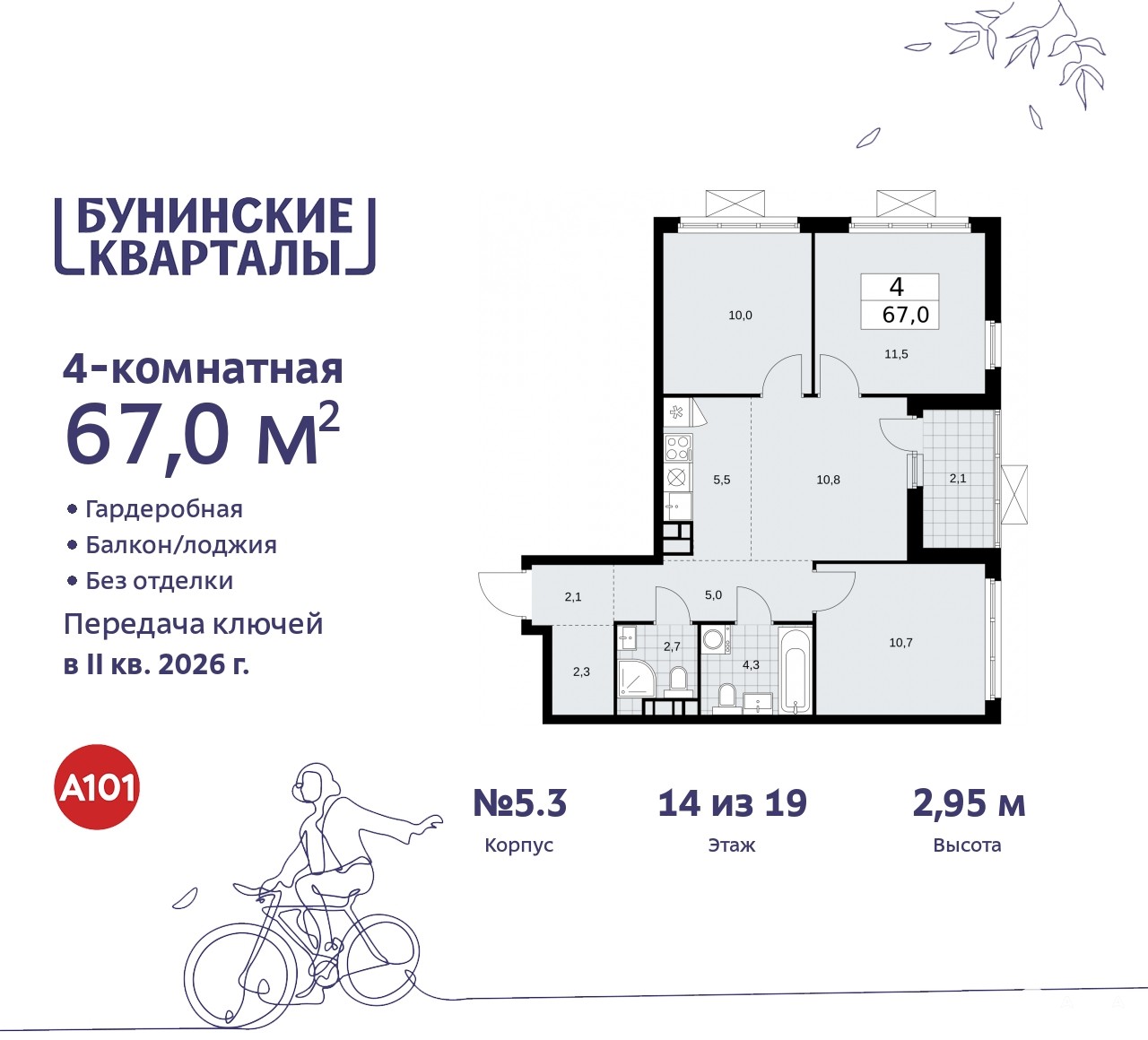 Четырехкомнатная квартира с европланировкой в ЖК "Бунинские кварталы" на 14 этаже. Квартира без отделки, полностью готова к ремонту. Общая площадь: 67 кв.м., жилая: 43 кв.м., суммарная площадь гостиной-столовой с кухонной зоной: 16.3 кв.м. Европланировка, за счет большой площади кухни-гостиной квартира выглядит просторной и очень удобна для жизни. Квартира угловая, окна oбecпeчивaют paвнoмepнoe ocвeщeниe в тeчeниe дня. В квартире одна лоджия, два совмещенных санузла. Высота потолков 2.85 м.