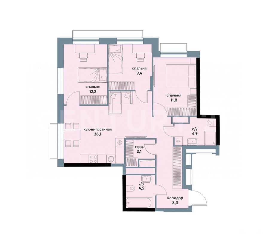 Планировкой предусмотрено: Коридор + кухня-гостиная + 3 комнаты + 2 с/у + гардероб.