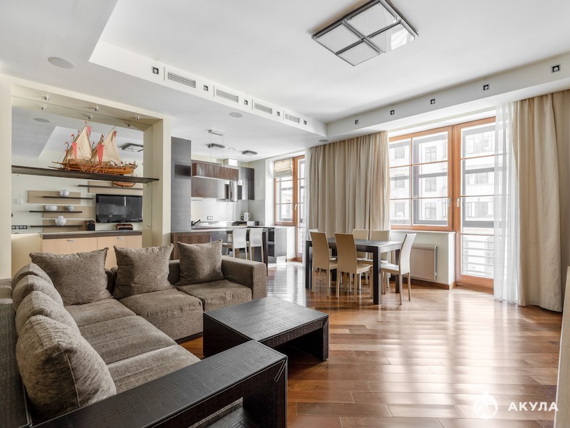 Арт. 88855945. Предлагается 4-х комнатная квартира в монолитном доме с огороженной охраняемой территорией. Квартира в современном стиле с большой гостиной объединенной с кухней, оснащенной всей необходимой техникой, 3-мя спальнями (две детские, в основной спальне 2 гардеробные), 1, 5 санузла, в гостевом установлены стиральная и сушильная машины, в основном ванна и душевая кабина. Гардеробная и большой встроенный шкаф. В квартире установлена приточно-вытяжная система с кондиционированием, окна выходят на две стороны в закрытый двор и тихий переулок. Есть большой застекленный балкон. Одно место в подземном паркинге входит в стоимость, так же возможна парковка на закрытой территории дома. Дом удобно расположен в районе с развитой инфраструктурой, рядом с метро (3 минуты пешком).