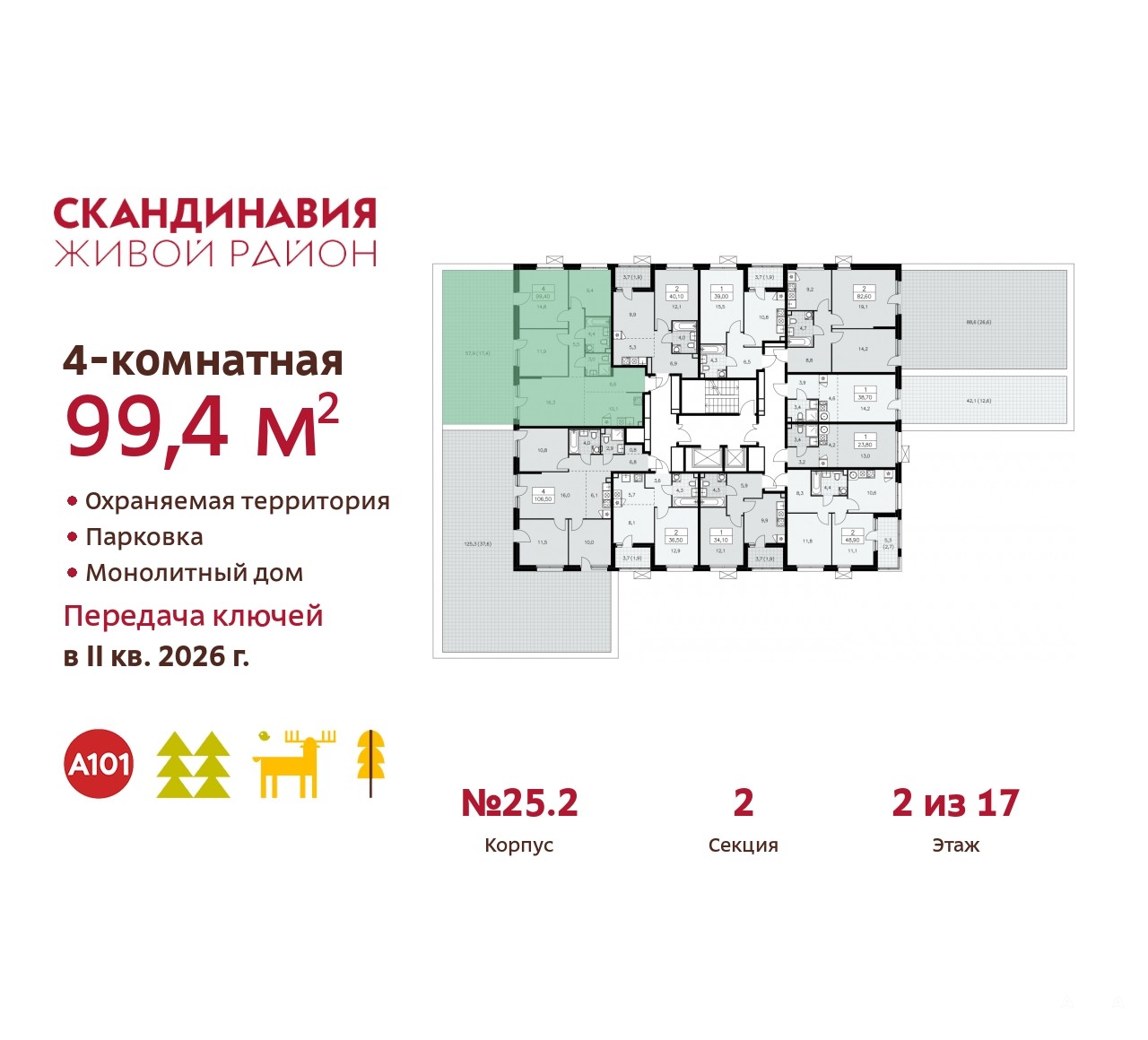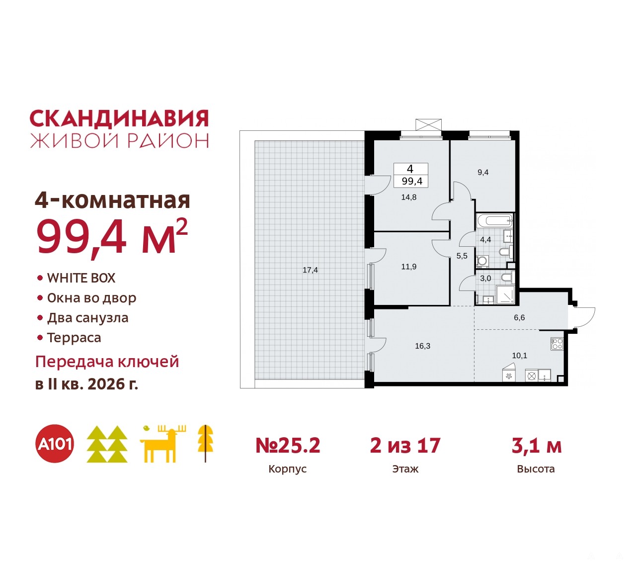 Продается 4-комн. квартира бизнес-класса с европланировкой и отделкой в ЖК "Скандинавия" на 2 этаже. Общая площадь: 99.4 кв.м., жилая: 52.4 кв.м., общая площадь гостиной-столовой с кухонной зоной: 26.4 кв.м. Европейская планировка, площадь комнат позволяет разместить в них все необходимое, а в просторной кухне-гостиной удобно как готовить, так и отдыхать. Угловая квартира, окна oбecпeчивaют paвнoмepнoe ocвeщeниe в тeчeниe дня. В квартире один балкон, два совмещенных санузла. Терраса площадью 17.4 кв.м. представляет собой роскошную зону отдыха, где вы на свой вкус можете создать атмосферу комфорта и уюта. Высота потолков 3.1 м.