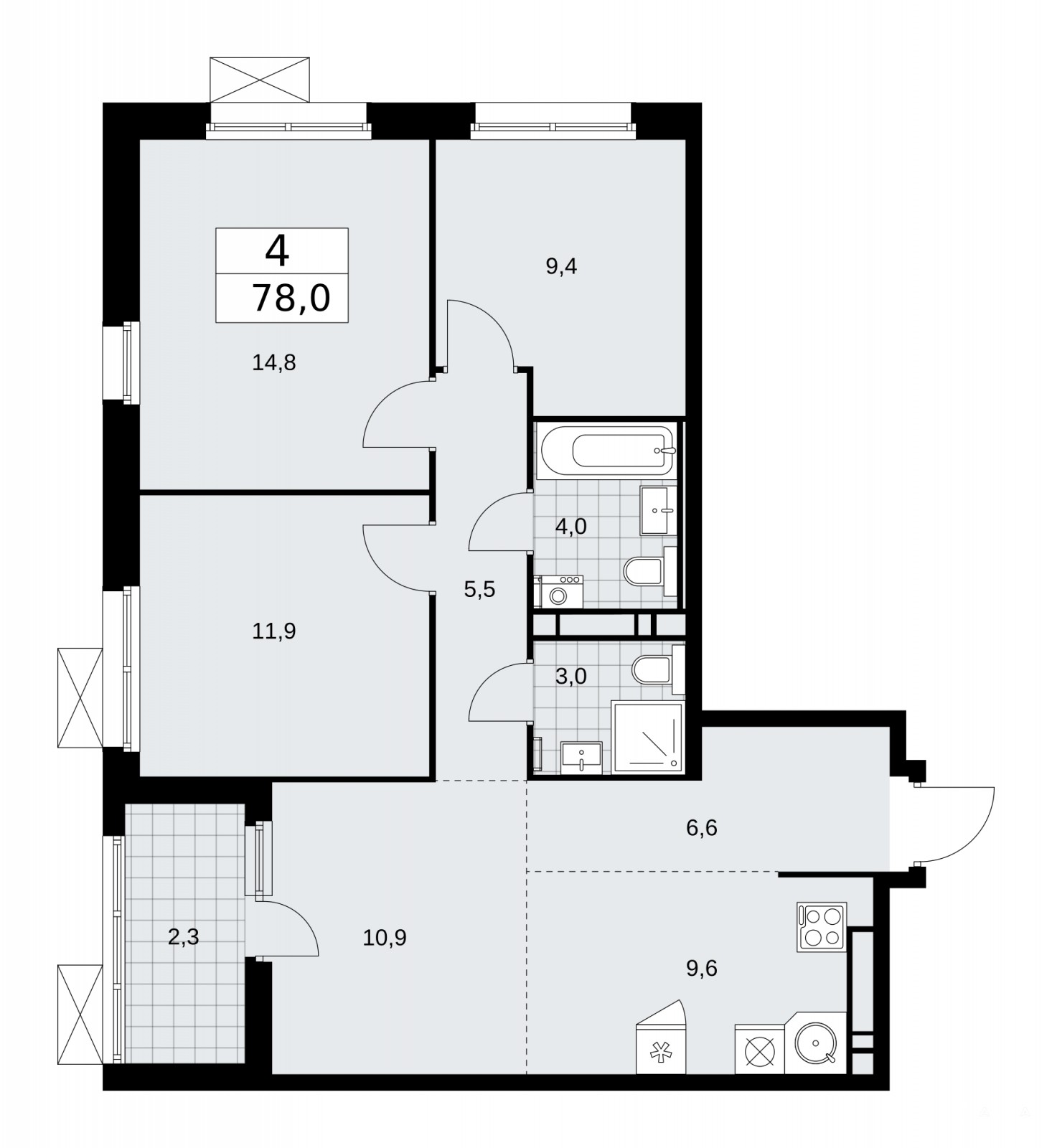4-комн. квартира с европланировкой и предчистовой отделкой в ЖК "Скандинавия" на 14 этаже. Общая площадь: 78 кв.м., жилая: 47 кв.м., суммарная площадь гостиной-столовой с кухонной зоной: 17.5 кв.м. Европланировка, зона гостиной комнаты объединена с кухней. Квартира угловая, очень светлая, естественная вентиляция при открытии окон. В квартире одна лоджия, два совмещенных санузла. Высота потолков 3.1 м.