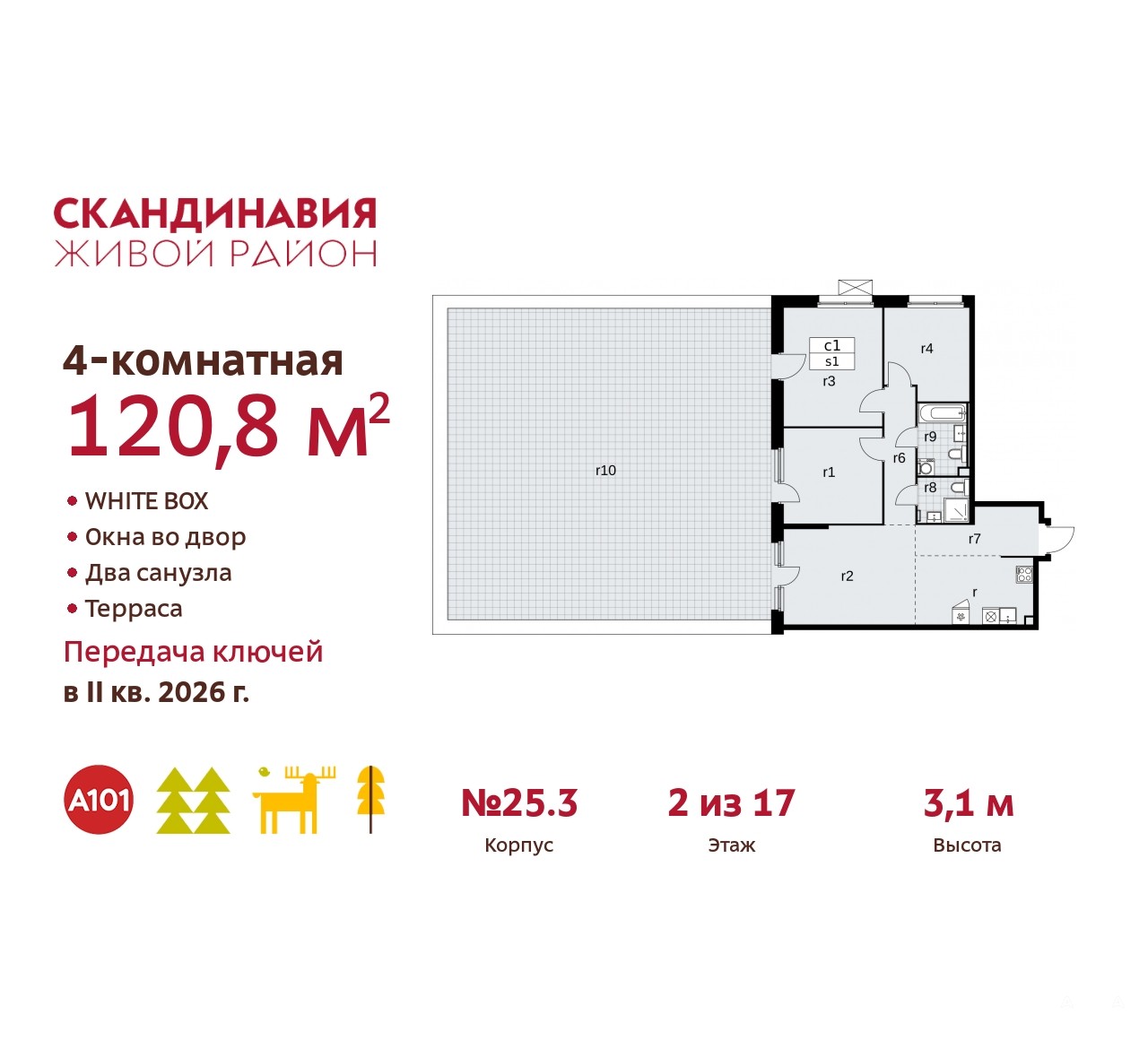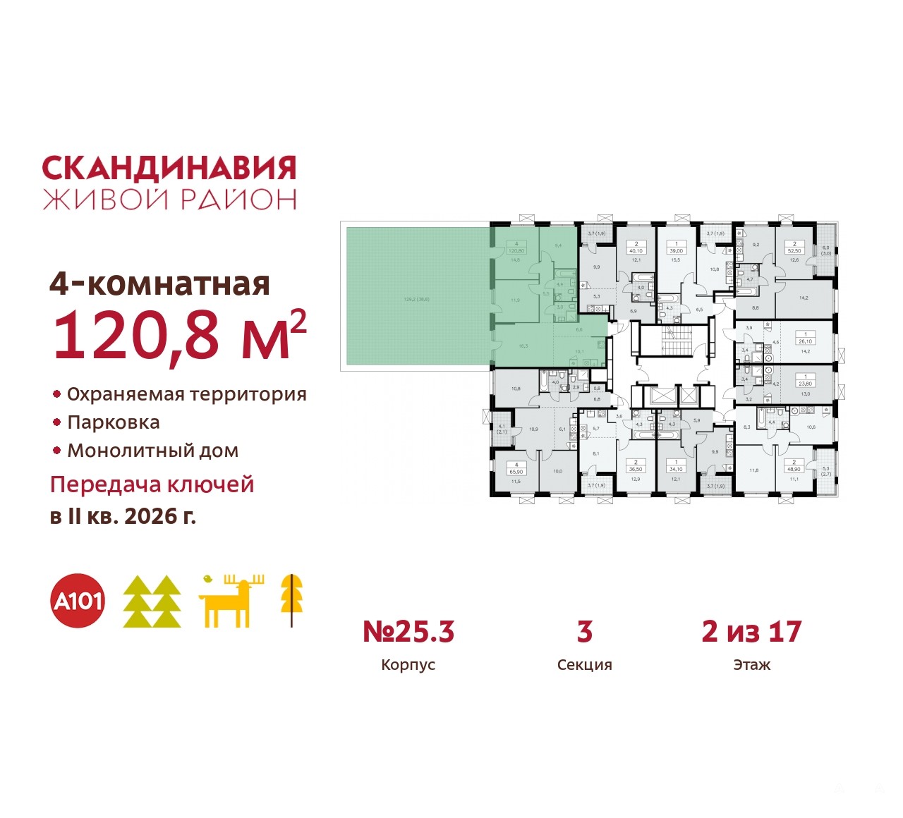Четырехкомнатная квартира бизнес-класса с европланировкой и предчистовой отделкой в ЖК "Скандинавия" на 2 этаже. Общая площадь: 120.8 кв.м., жилая: 52.4 кв.м., суммарная площадь гостиной-столовой с кухонной зоной: 21.3 кв.м. Европланировка, зона гостиной комнаты объединена с кухней. Квартира угловая, очень светлая, естественная вентиляция при открытии окон. В квартире один балкон, два совмещенных санузла. Наличие террасы площадью 38.8 кв.м. в квартире открывает возможность для создания зон отдыха в кругу семьи и друзей. Высота потолков 3.1 м.