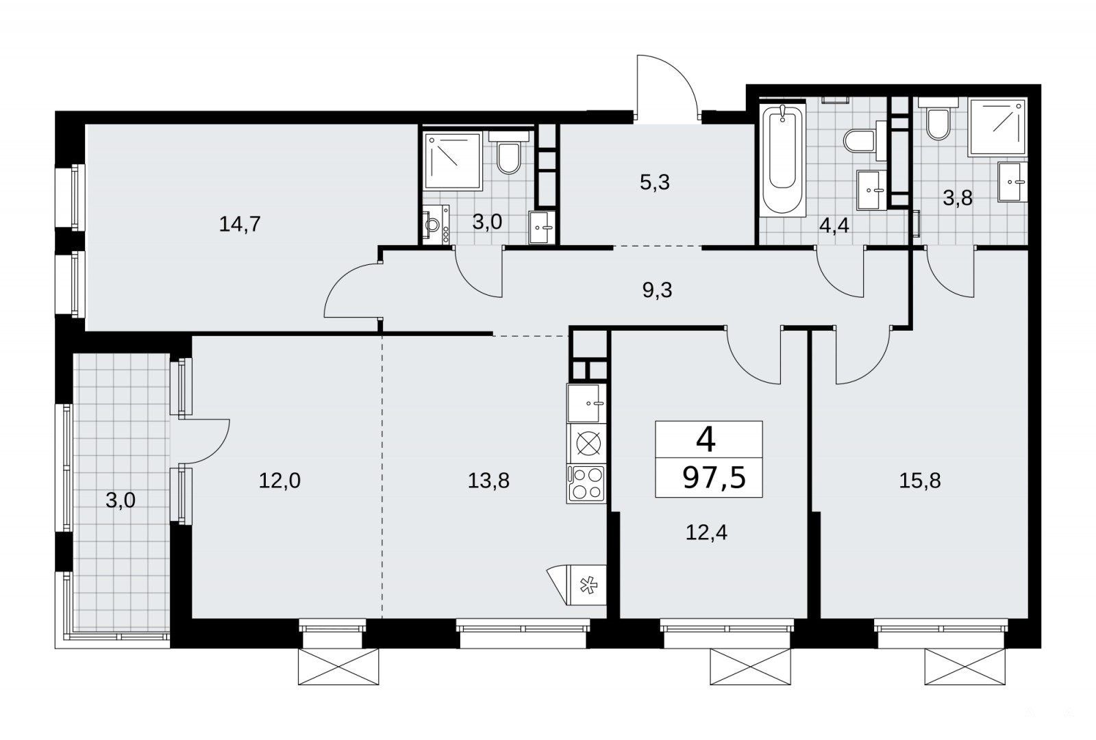 4-комн. квартира с европланировкой в ЖК "Скандинавия" на 15 этаже. Квартира без отделки, новый собственник может сделать ремонт по своему дизайн-проекту. Общая площадь: 97.5 кв.м., жилая: 54.9 кв.м., общая площадь гостиной-столовой с кухонной зоной: 25.8 кв.м. Европланировка, площадь комнат позволяет разместить в них все необходимое, а в просторной кухне-гостиной удобно как готовить, так и отдыхать. Угловая квартира, очень светлая, естественная вентиляция при открытии окон. В квартире одна лоджия, три совмещенных санузла. Высота потолков 3.1 м.