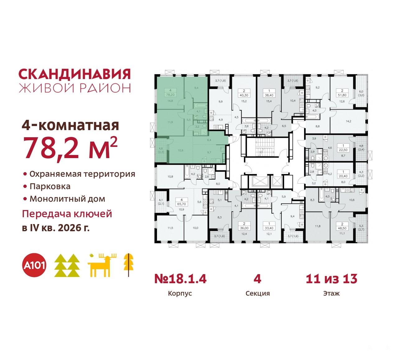 Квартира находится в корпусе 2.18.1.4. Дом монолитный, одноподъездный, высотой 13 этажей. На этаже 10 квартир. В подъезде 1 пассажирский и 1 грузовой лифт. Начало строительства - 1 квартал 2024 года. Окончание строительства - 4 квартал 2026 года. Оформление сделки по договору долевого участия.
