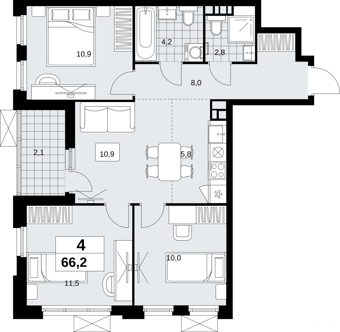 Просторная четырехкомнатная квартира с европланировкой и отделкой в ЖК "Скандинавия" на 5 этаже. Общая площадь: 66.2 кв.м., жилая: 43.3 кв.м., общая площадь гостиной-столовой с кухонной зоной: 16.7 кв.м. Европейская планировка, за счет большой площади кухни-гостиной квартира выглядит просторной и очень удобна для жизни. Квартира угловая, очень светлая, естественная вентиляция при открытии окон. В квартире одна лоджия, два совмещенных санузла. Высота потолков 2.97 м.