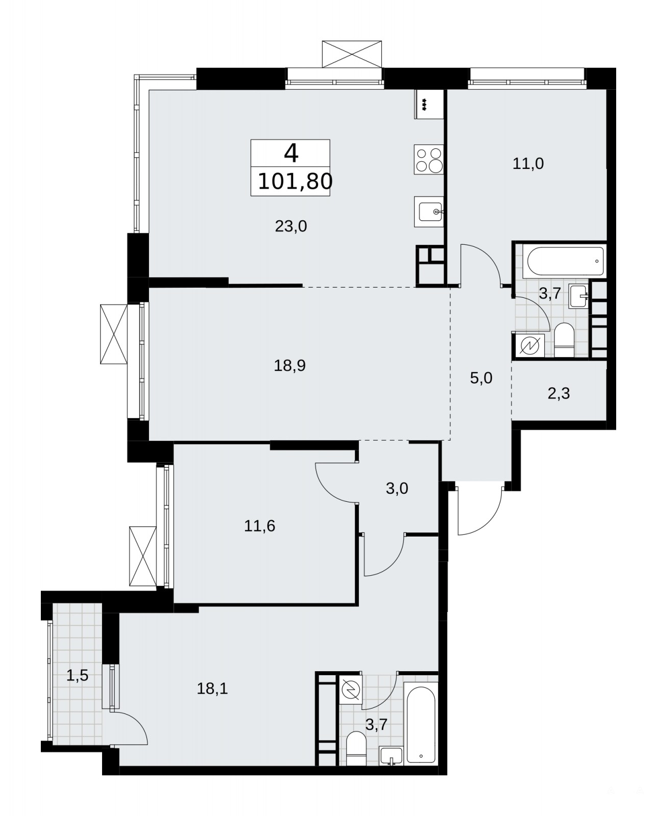 4-комн. квартира бизнес-класса от застройщика с предчистовой отделкой в ЖК "Скандинавия" на 17 этаже. Общая площадь: 101.8 кв.м., жилая: 59.6 кв.м., площадь просторной кухни-столовой: 23 кв.м. Угловая квартира, окна oбecпeчивaют paвнoмepнoe ocвeщeниe в тeчeниe дня. В квартире один балкон, два совмещенных санузла. Высота потолков 3.1 м.