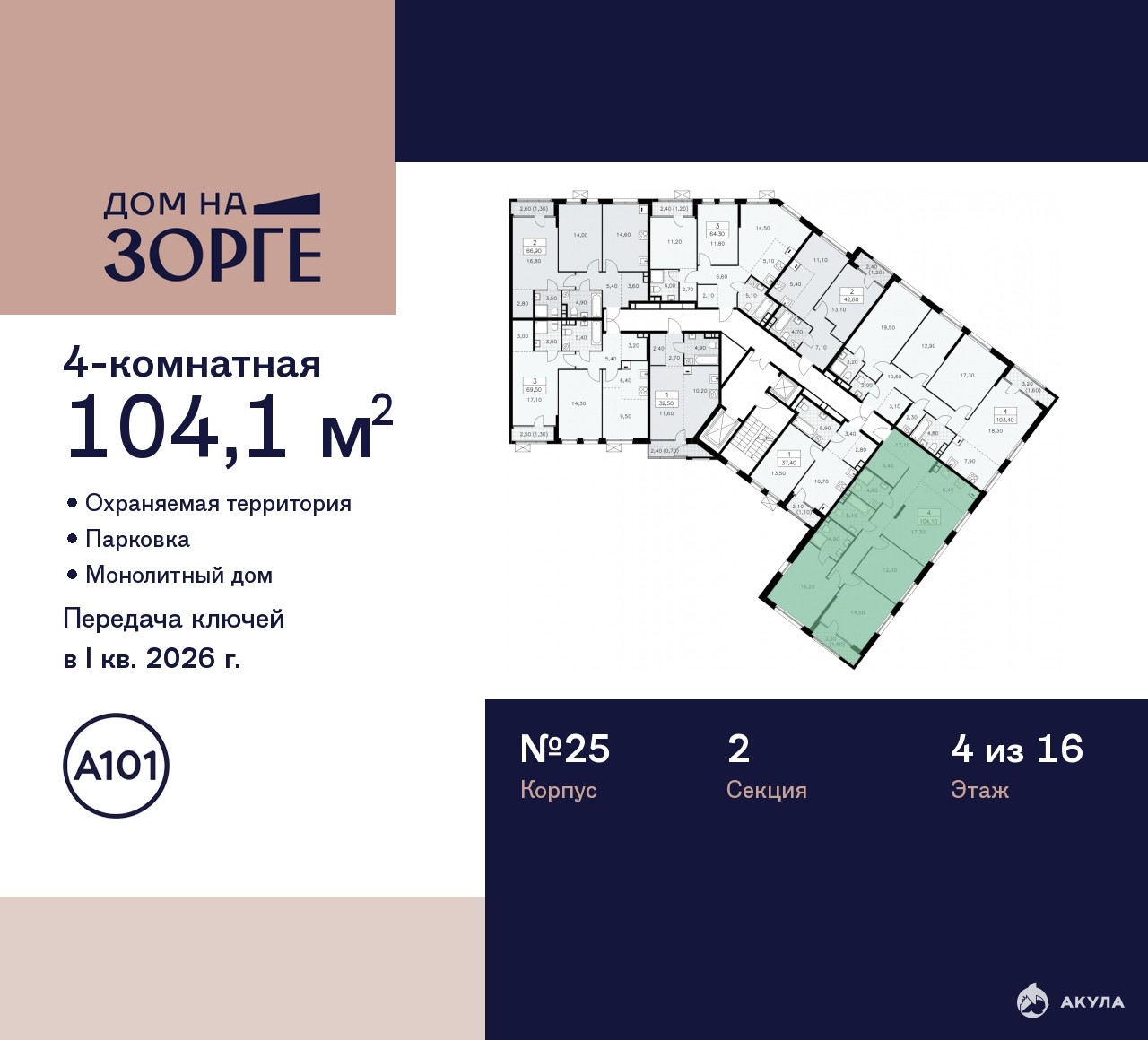 4-комн. квартира с европланировкой и предчистовой отделкой в ЖК "Дом на Зорге" на 4 этаже. Общая площадь: 104.1 кв.м., жилая: 60 кв.м., общая площадь гостиной-столовой с кухонной зоной: 23.7 кв.м. Европланировка, кухня и гостиная объединены в одно просторное помещение. Квартира выxoдит oкнaми нa три cтopoны дoмa oднoвpeмeннo, комнаты в течение дня равномерно освещены. В квартире одна лоджия, три совмещенных санузла. Высота потолков 3.1 м.