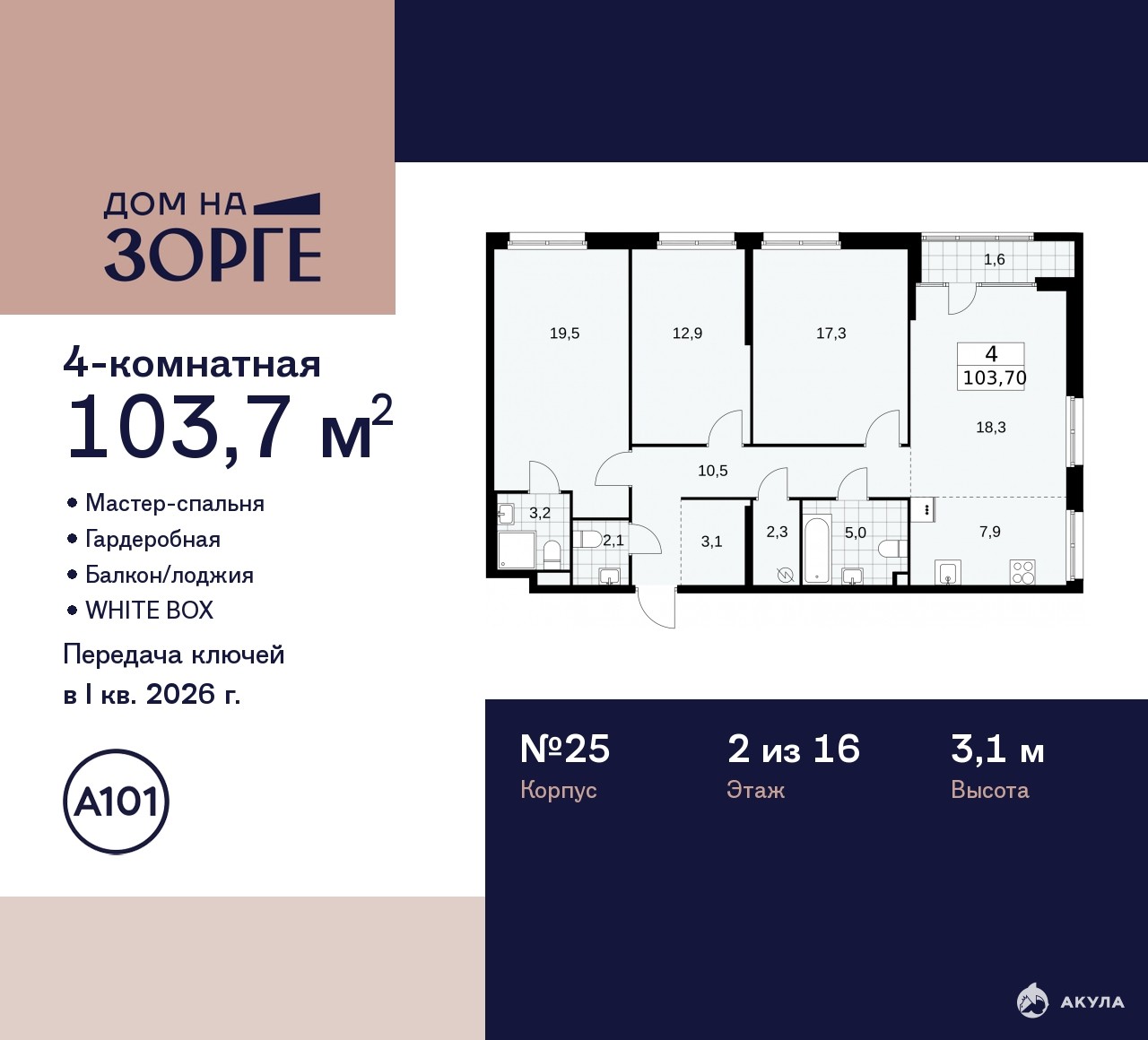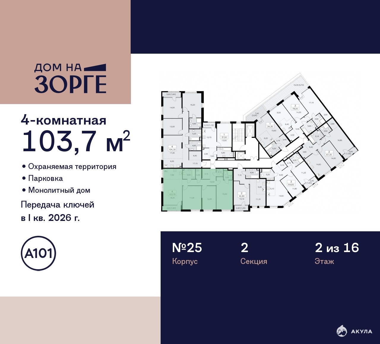 Просторная 4-комн. квартира с европланировкой и предчистовой отделкой в ЖК "Дом на Зорге" на 2 этаже. Общая площадь: 103.7 кв.м., жилая: 68 кв.м., суммарная площадь гостиной-столовой с кухонной зоной: 26.2 кв.м. Европланировка, кухня и гостиная объединены в одно просторное помещение. Угловая квартира, идеально подойдет любителям тишины и панорамных видов. В квартире одна лоджия, два совмещенных и один раздельный санузел. Высота потолков 3.1 м.