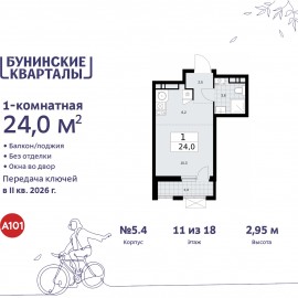 Однокомнатная квартира-студия в ЖК "Бунинские кварталы" на 11 этаже. Квартира без отделки, после выдачи ключей можно делать ремонт. Общая площадь: 24 кв.м., площадь гостиной 16.5 кв.м., из которых 6.2 кв.м. выделено под кухонную зону. Все окна выходят на одну сторону. В квартире один...