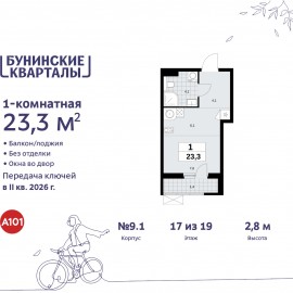 Просторная однокомнатная квартира-студия в ЖК "Бунинские кварталы" на 17 этаже. Квартира без отделки, после получения ключей можно делать ремонт. Общая площадь: 23.3 кв.м., площадь гостиной 13.7 кв.м., из которых 6.1 кв.м. выделено под кухонную зону. Все окна выходят на одну сторону....