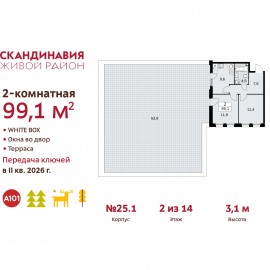 2-комн. квартира бизнес-класса с предчистовой отделкой в ЖК "Скандинавия" на 2 этаже. Общая площадь: 99.1 кв.м., жилая: 23.3 кв.м., площадь просторной кухни-столовой: 9.6 кв.м. Угловая квартира, очень светлая, естественная вентиляция при открытии окон. В квартире один балкон, один...