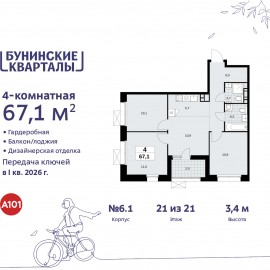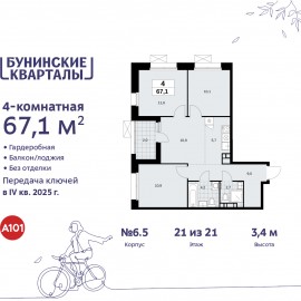 Продается четырехкомнатная квартира бизнес-класса с европланировкой и отделкой в ЖК "Бунинские кварталы" на 21 этаже. Общая площадь: 67.1 кв.м., жилая: 43.5 кв.м., суммарная площадь гостиной-столовой с кухонной зоной: 16.6 кв.м. Европланировка, за счет большой площади кухни-гостиной...