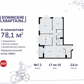 4-комн. квартира бизнес-класса от застройщика в ЖК "Бунинские кварталы" на 21 этаже. Квартира без отделки, после получения ключей можно делать ремонт. Общая площадь: 78.4 кв.м. Высота потолков 3.1 м. Квартира будет сдана без отделки. Установлены стеклопакеты с повышенной тепло- и...