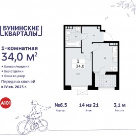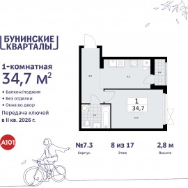 Просторная 1-комн. квартира в ЖК "Бунинские кварталы" на 17 этаже. Квартира без отделки, полностью готова к ремонту. Общая площадь: 34.6 кв.м. Высота потолков 2.8 м. Квартира будет сдана без отделки. Установлены стеклопакеты с повышенной тепло- и шумоизоляцией, установлены...