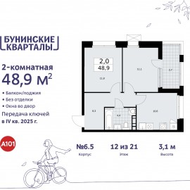 2-комн. квартира бизнес-класса в ЖК "Бунинские кварталы" на 12 этаже. Квартира без отделки, после выдачи ключей можно делать ремонт. Общая площадь: 48.7 кв.м. Высота потолков 3.1 м. Квартира будет сдана без отделки. Установлены стеклопакеты с повышенной тепло- и шумоизоляцией,...