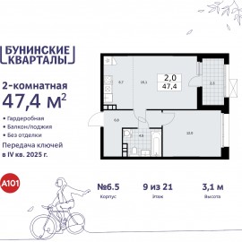 2-комн. квартира бизнес-класса с европланировкой в ЖК "Бунинские кварталы" на 9 этаже. Квартира без отделки, полностью готова к чистовой отделке и дальнейшему ремонту. Общая площадь: 47.1 кв.м., жилая: 26.9 кв.м., суммарная площадь гостиной-столовой с кухонной зоной: 21.7 кв.м....