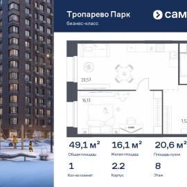 Строим кварталы для жизни с заботой о будущем. Предлагаются 1-комнатные апартаменты бизнес-класса 49, 05 кв.м в корпусе 2.2 на 8 этаже, в МФК «Тропарево Парк» Апартаменты с чистовой отделкой. Доступность дополнительных опций уточняйте у застройщика. Прописка не предусмотрена в...
