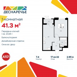 Однокомнатная квартира с отделкой в ЖК "Деснаречье" на 17 этаже. Общая площадь: 41.3 кв.м., жилая: 13.8 кв.м., площадь просторной кухни-столовой: 16.2 кв.м. Все окна выходят на одну сторону. В квартире одна лоджия, один совмещенный санузел. Высота потолков 2.95 м. Эта квартира будет сдана...