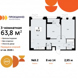 3-комн. квартира с европланировкой в ЖК "Прокшино" на 8 этаже. Квартира без отделки, новый владелец может сделать ремонт по индивидуальному проекту. Общая площадь: 63.8 кв.м., жилая: 40.5 кв.м., общая площадь гостиной-столовой с кухонной зоной: 23.8 кв.м. Европейская планировка,...