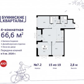 Просторная четырехкомнатная квартира с отделкой в ЖК "Бунинские кварталы" на 15 этаже. Общая площадь: 66.4 кв.м. Высота потолков 2.8 м. В квартире будет выполнена полная отделка по одному из нескольких авторских дизайн проектов. При покупке Вы сможете выбрать именно тот стиль,...