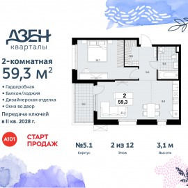2-комн. квартира бизнес-класса с европланировкой и отделкой в ЖК "Дзен-кварталы" на 2 этаже. Общая площадь: 59.3 кв.м., жилая: 33.8 кв.м., общая площадь гостиной-столовой с кухонной зоной: 26.1 кв.м. Европейская планировка, за счет большой площади кухни-гостиной квартира выглядит...