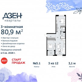 3-комн. квартира бизнес-класса с европланировкой и отделкой в ЖК "Дзен-кварталы" на 3 этаже. Общая площадь: 80.9 кв.м., жилая: 41.9 кв.м., общая площадь гостиной-столовой с кухонной зоной: 24.8 кв.м. Европланировка, площадь комнат позволяет разместить в них все необходимое, а в...