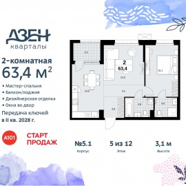 2-комн. квартира бизнес-класса с европланировкой и отделкой в ЖК "Дзен-кварталы" на 5 этаже. Общая площадь: 63.4 кв.м., жилая: 29.4 кв.м., общая площадь гостиной-столовой с кухонной зоной: 29.1 кв.м. Европланировка, зона гостиной комнаты объединена с кухней. Комнаты изолированные, все...