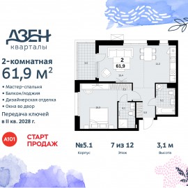 Двухкомнатная квартира бизнес-класса с европланировкой и отделкой в ЖК "Дзен-кварталы" на 7 этаже. Общая площадь: 61.9 кв.м., жилая: 30.7 кв.м., суммарная площадь гостиной-столовой с кухонной зоной: 26.6 кв.м. Европейская планировка, кухня и гостиная объединены в одно просторное...