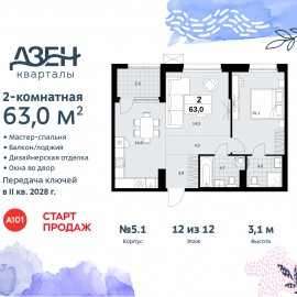 Двухкомнатная квартира бизнес-класса с европланировкой и отделкой в ЖК "Дзен-кварталы" на 12 этаже. Общая площадь: 63 кв.м., жилая: 29.4 кв.м., общая площадь гостиной-столовой с кухонной зоной: 28.9 кв.м. Европейская планировка, за счет большой площади кухни-гостиной квартира...
