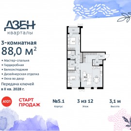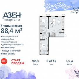 3-комн. квартира бизнес-класса с европланировкой и отделкой в ЖК "Дзен-кварталы" на 3 этаже. Общая площадь: 88 кв.м., жилая: 42.2 кв.м., общая площадь гостиной-столовой с кухонной зоной: 30.4 кв.м. Европланировка, площадь комнат позволяет разместить в них все необходимое, а в...
