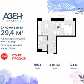 Продается 1-комн. квартира бизнес-класса-студия от застройщика с отделкой в ЖК "Дзен-кварталы" на 4 этаже. Общая площадь: 29.4 кв.м., площадь гостиной 19.6 кв.м., из которых 8.4 кв.м. выделено под кухонную зону. Все окна выходят на одну сторону. В квартире один совмещенный санузел....