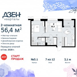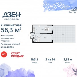 Просторная 2-комн. квартира бизнес-класса с отделкой в ЖК "Дзен-кварталы" на 7 этаже. Общая площадь: 56.4 кв.м., жилая: 23 кв.м., площадь просторной кухни-столовой: 12 кв.м. Комнаты изолированные, все окна выходят на одну сторону. В квартире одна лоджия, два совмещенных санузла. Высота...