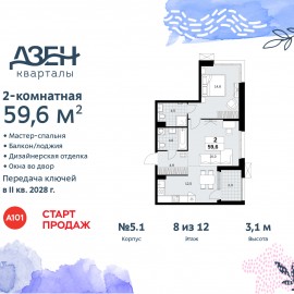 Просторная 2-комн. квартира бизнес-класса с европланировкой и отделкой в ЖК "Дзен-кварталы" на 8 этаже. Общая площадь: 59.6 кв.м., жилая: 30.8 кв.м., суммарная площадь гостиной-столовой с кухонной зоной: 28.5 кв.м. Европейская планировка, кухня-гостиная - идеальный вариант для тех, кто...