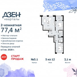 Продается 2-комн. квартира бизнес-класса от застройщика с отделкой в ЖК "Дзен-кварталы" на 5 этаже. Общая площадь: 77.4 кв.м., жилая: 24.8 кв.м., площадь просторной кухни-столовой: 27.9 кв.м. Квартира - распашонка, без проходных комнат, окна выходят на paзные стороны дома. В квартире одна...