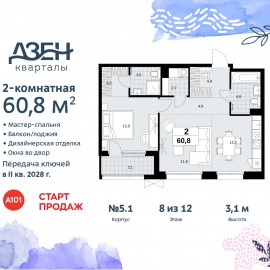 2-комн. квартира бизнес-класса с европланировкой и отделкой в ЖК "Дзен-кварталы" на 8 этаже. Общая площадь: 60.8 кв.м., жилая: 23.8 кв.м., суммарная площадь гостиной-столовой с кухонной зоной: 22.8 кв.м. Европейская планировка, кухня и гостиная объединены в одно просторное помещение....