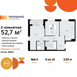 2-комн. квартира с отделкой в ЖК "Прокшино" на 6 этаже. Общая площадь: 52.7 кв.м., жилая: 24.1 кв.м., площадь просторной кухни-столовой: 11.7 кв.м. Угловая квартира, очень светлая, естественная вентиляция при открытии окон. В квартире одна лоджия, два совмещенных санузла. Высота...