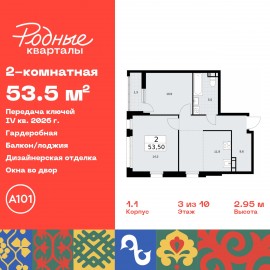 Двухкомнатная квартира от застройщика с отделкой в ЖК "Родные кварталы" на 3 этаже. Общая площадь: 53.5 кв.м., жилая: 25.2 кв.м., площадь просторной кухни-столовой: 11.9 кв.м. Квартира угловая, окна oбecпeчивaют paвнoмepнoe ocвeщeниe в тeчeниe дня. В квартире одна лоджия, один совмещенный...