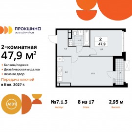 Продается двухкомнатная квартира с европланировкой и отделкой в ЖК "Прокшино" на 8 этаже. Общая площадь: 47.9 кв.м., жилая: 29.7 кв.м., суммарная площадь гостиной-столовой с кухонной зоной: 23 кв.м. Европланировка, зона гостиной комнаты объединена с кухней. Комнаты изолированные,...