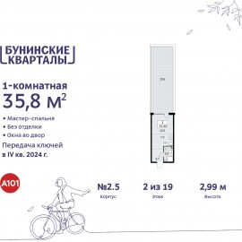 Однокомнатная квартира-студия в ЖК "Бунинские кварталы" на 2 этаже. Квартира без отделки, после оформления собственности можно делать ремонт. Общая площадь: 35.9 кв.м. Наличие в квартире террасы открывает возможность для обустройства дополнительной площади. Высота потолков...