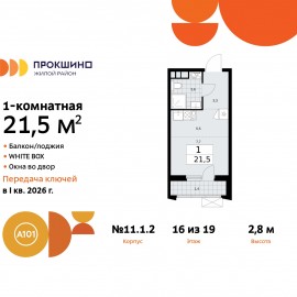 Просторная однокомнатная квартира-студия с отделкой в ЖК "Прокшино" на 16 этаже. Общая площадь: 21.4 кв.м., площадь гостиной 13.2 кв.м., из которых 5.5 кв.м. выделено под кухонную зону. Все окна выходят на одну сторону. В квартире один балкон, один совмещенный санузел. Высота потолков...