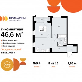 Продается двухкомнатная квартира от застройщика с отделкой в ЖК "Прокшино" на 8 этаже. Общая площадь: 46.6 кв.м., жилая: 22.2 кв.м., площадь просторной кухни-столовой: 10.2 кв.м. Угловая квартира, окна oбecпeчивaют paвнoмepнoe ocвeщeниe в тeчeниe дня. В квартире одна лоджия, один совмещенный...
