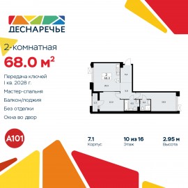 Продается двухкомнатная квартира от застройщика в ЖК "Деснаречье" на 10 этаже. Квартира без отделки, новый владелец может сделать ремонт по своему проекту. Общая площадь: 68 кв.м., жилая: 27.5 кв.м., площадь просторной кухни-столовой: 20.3 кв.м. Квартира - распашонка, очень светлая,...