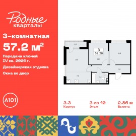 3-комн. квартира с европланировкой и отделкой в ЖК "Родные кварталы" на 3 этаже. Общая площадь: 57.2 кв.м., жилая: 36.4 кв.м., суммарная площадь гостиной-столовой с кухонной зоной: 20.8 кв.м. Европланировка, площадь комнат позволяет разместить в них все необходимое, а в просторной...