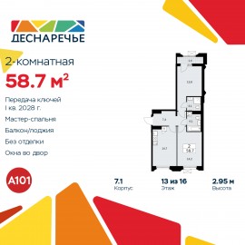 2-комн. квартира в ЖК "Деснаречье" на 13 этаже. Квартира без отделки, новый владелец может сделать ремонт по своему дизайн-проекту. Общая площадь: 58.7 кв.м., жилая: 28 кв.м., площадь просторной кухни-столовой: 14.7 кв.м. Квартира - распашонка, без проходных комнат, окна выходят на paзные...